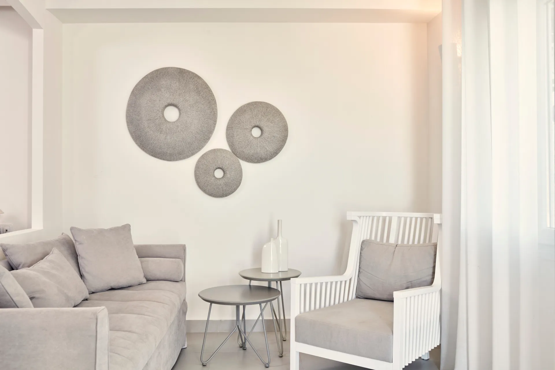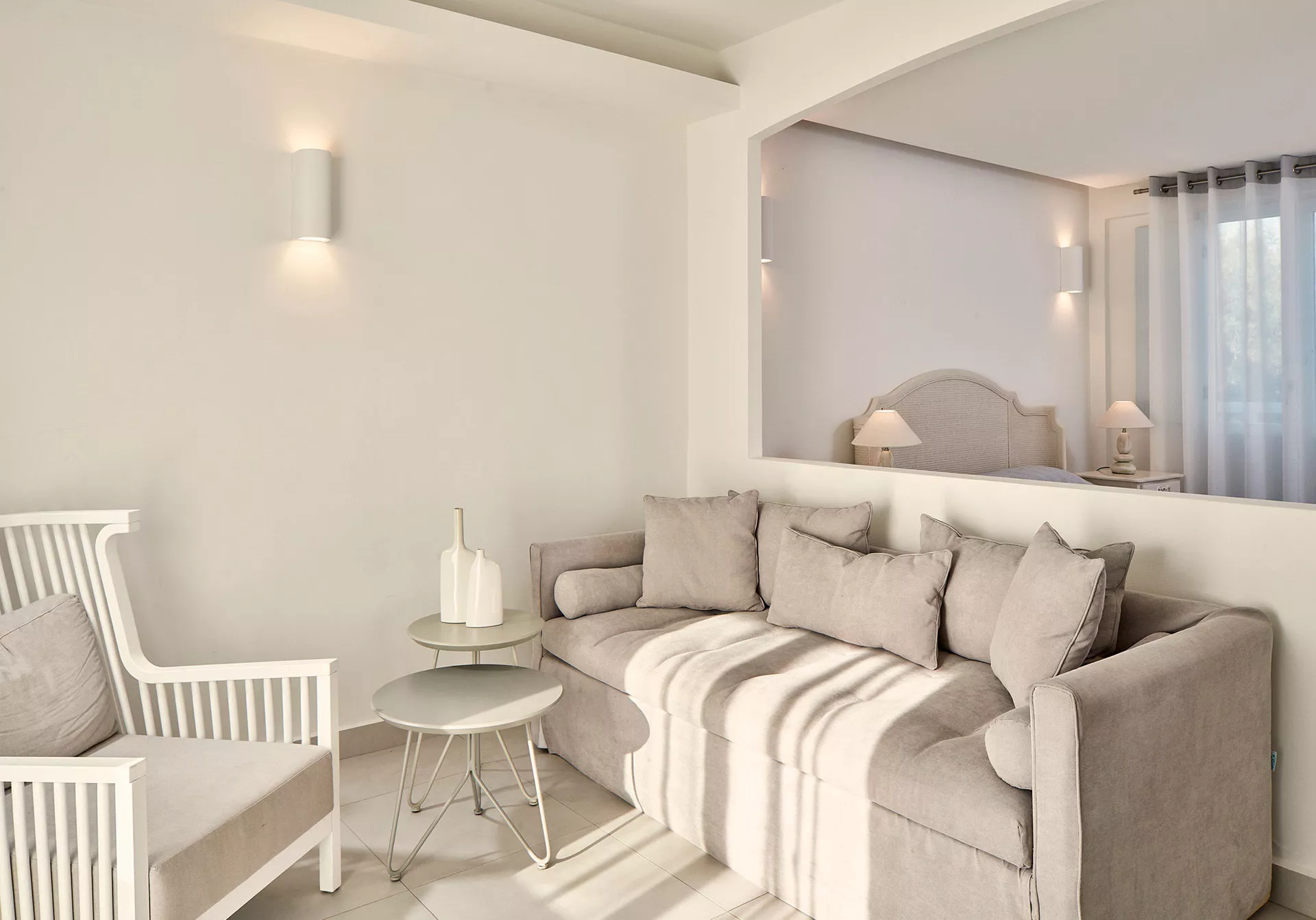 One double bed or two twin beds with spacious living area. Can accommodate maximum 3 people. Features air-condition (heat and cold), mini bar, direct dial telephone, satellite TV (No Greek channels available), private safety deposit box, hair dryer, shower, balcony or terrace with a view either to the sea either the pool. For triple use, there is a sofa bed for the extra person.